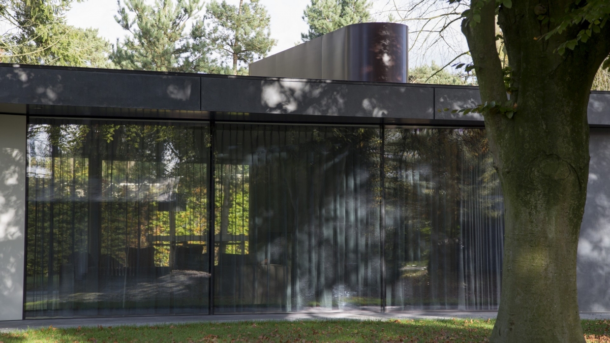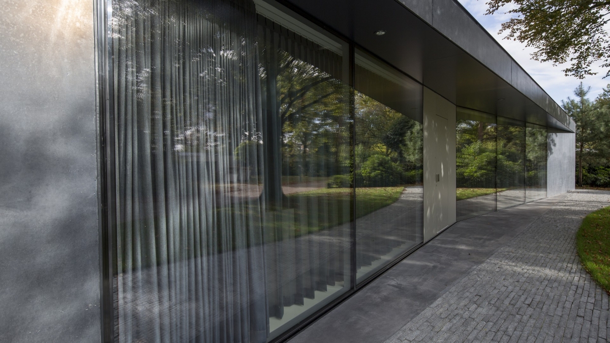 Voor een echtpaar in Noord-Brabant ontwierp Barcode Architects een bijzonder strakke villa. Een eenvoudig maar geraffineerd volume, dat als een massief object in het groen staat. De grondvorm is een rechthoek, waarvan de lange zijden in het midden naar binnen geknikt zijn. Het middendeel van de woning is heel open en licht met vliesgevels, de koppen hebben juist zware en meer gesloten gevels van gepolijst beton. Een huis met contrasten.
