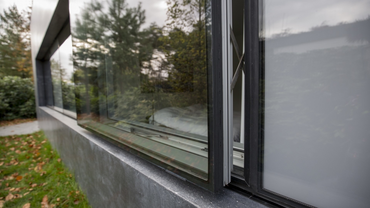 De centrale leefruimte is ingeklemd tussen twee meer introverte volumes met ruimtes, die meer privacy vragen. Bij de gastenkamer, waar de betonnen gevel naar buiten stulpt, is een parallel uitzetraam met motorische bediening toegepast. Als het raam is uitgezet, ligt het glas precies op een vlak met de uitstulping. De kamer kan zo bijna onzichtbaar van buiten geventileerd worden. De uitstulping levert binnen een brede vensterbank op, waar je echt op kunt zitten.