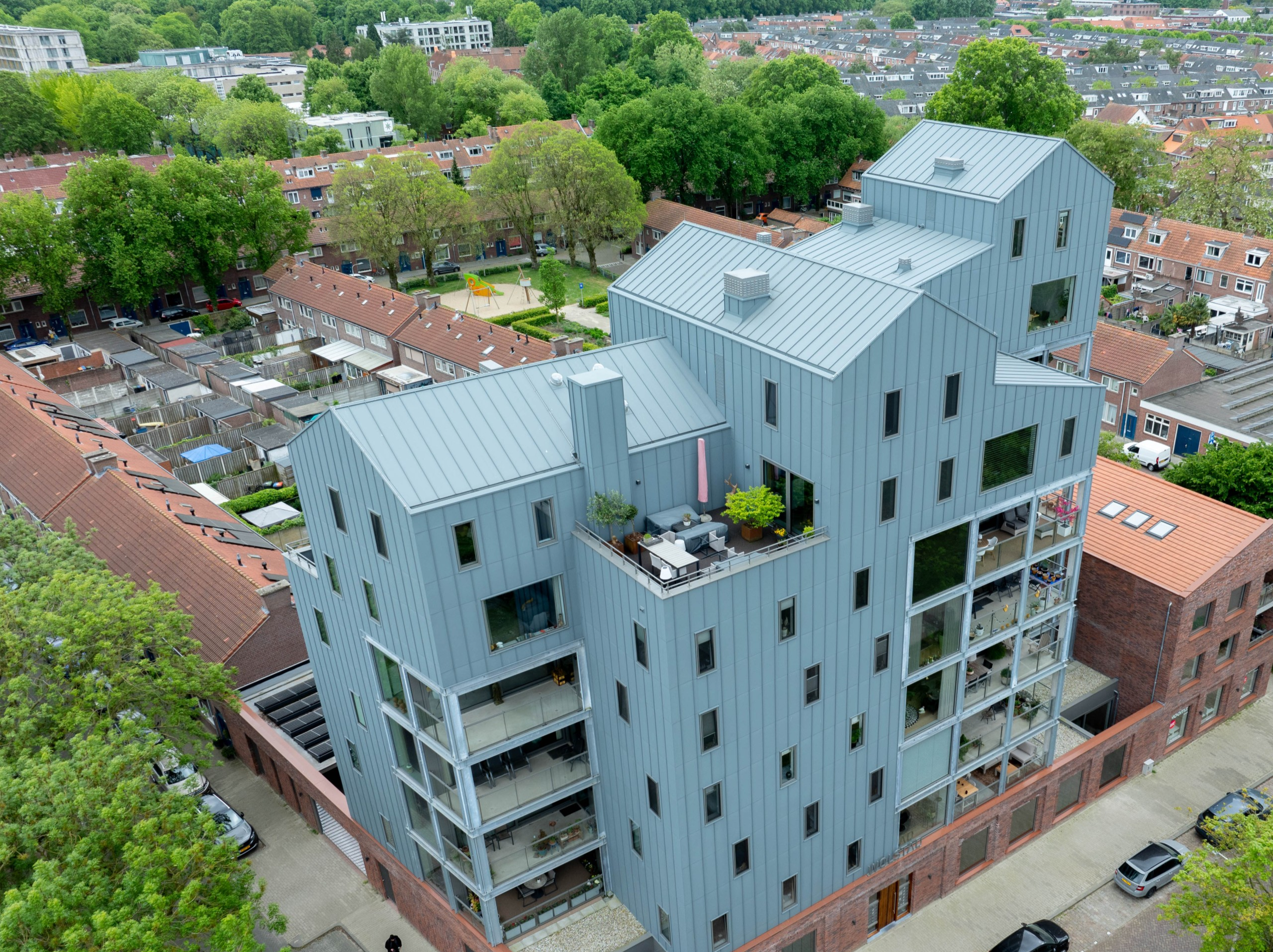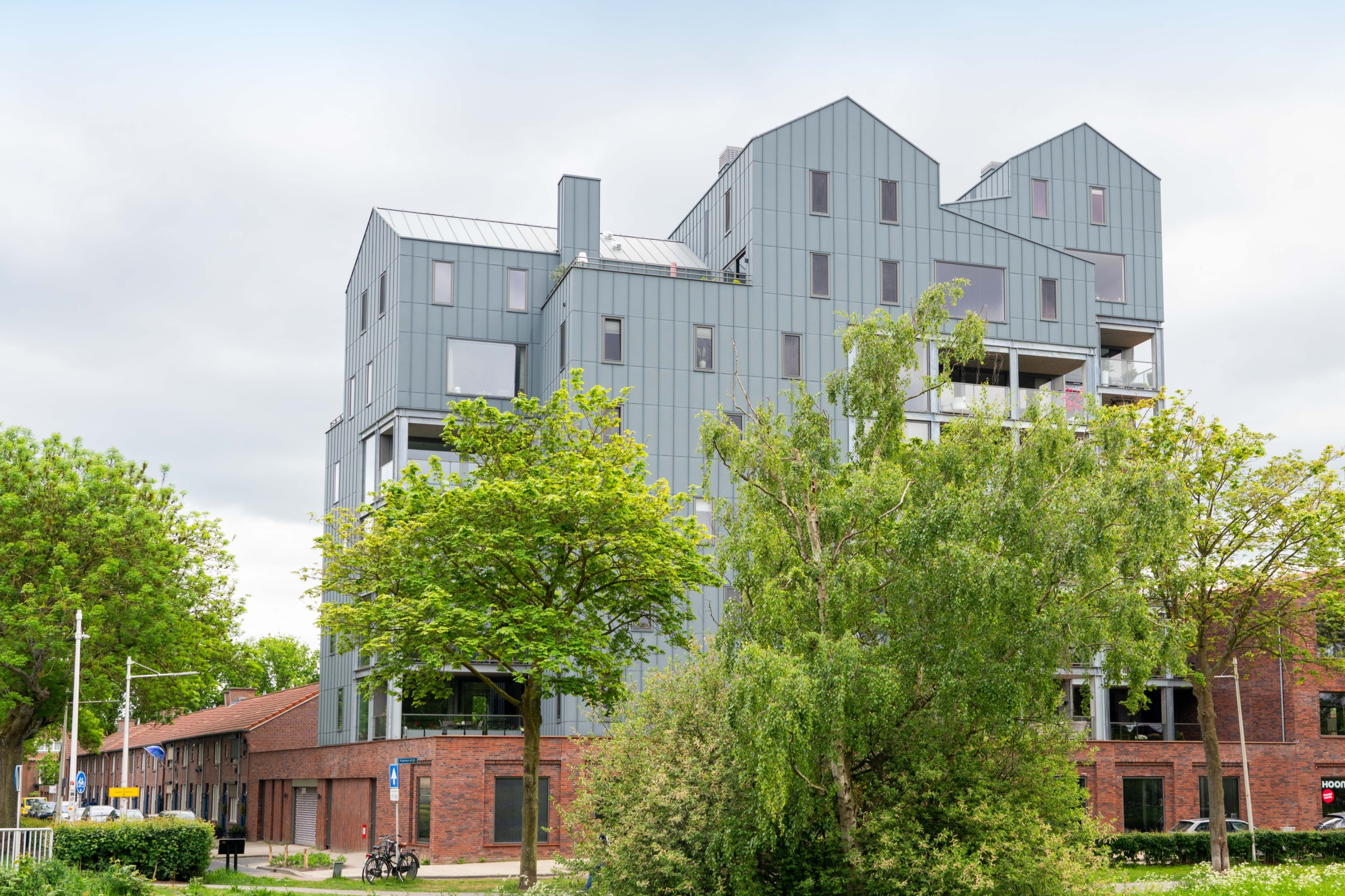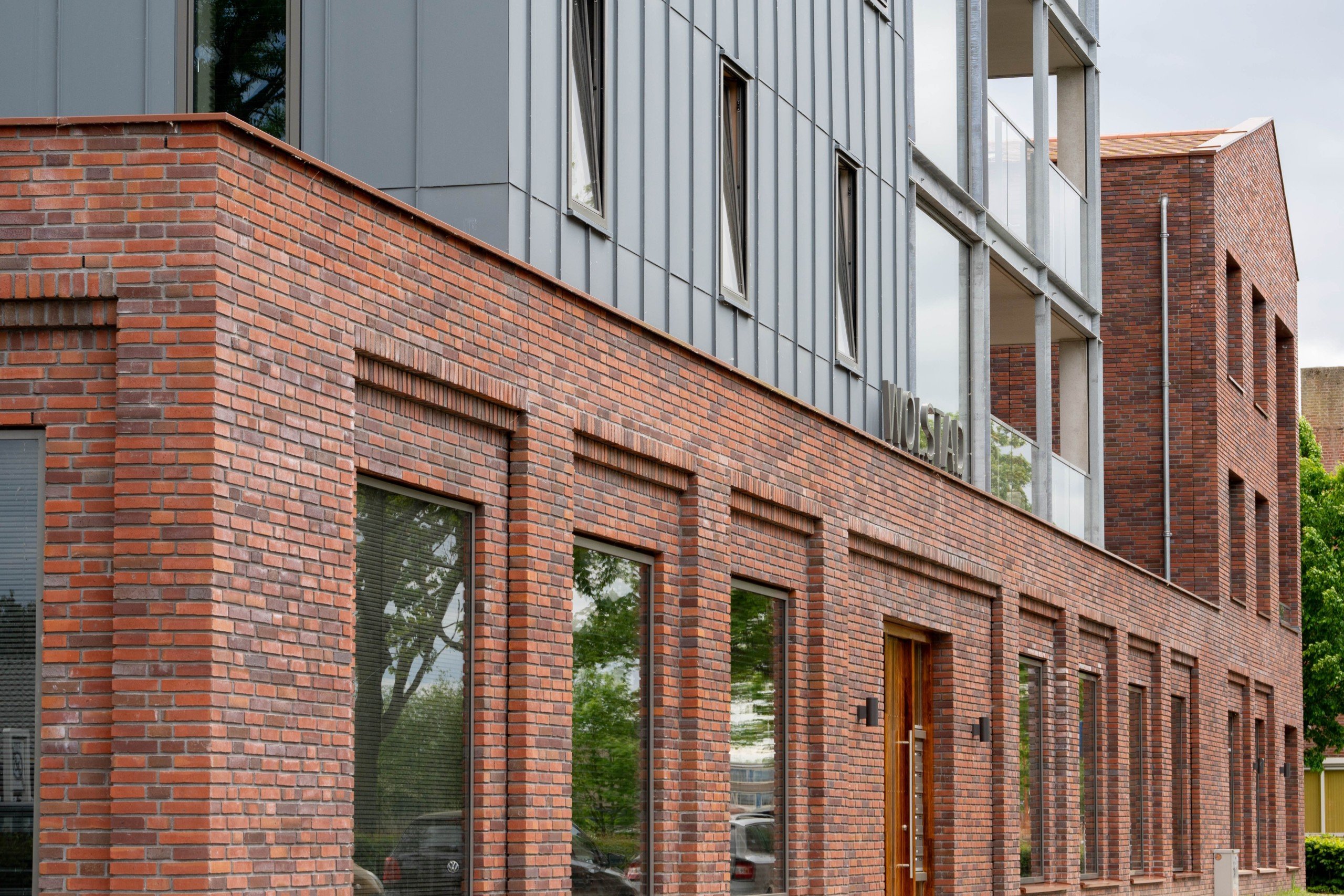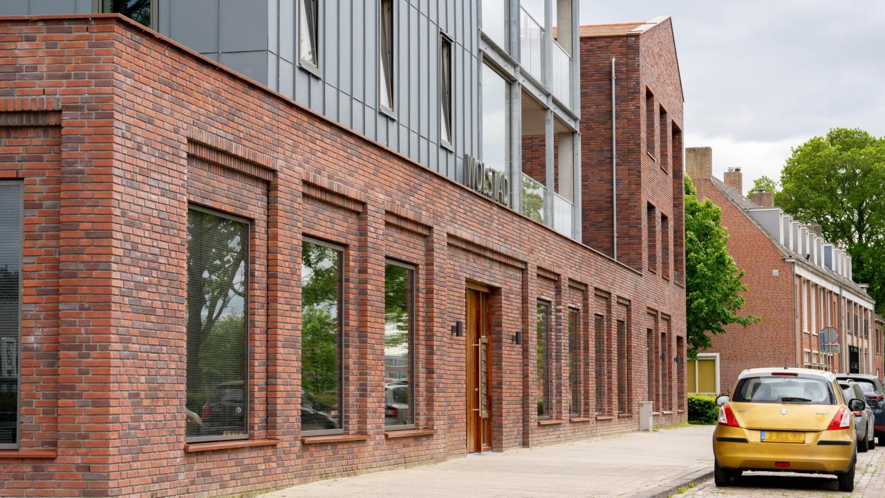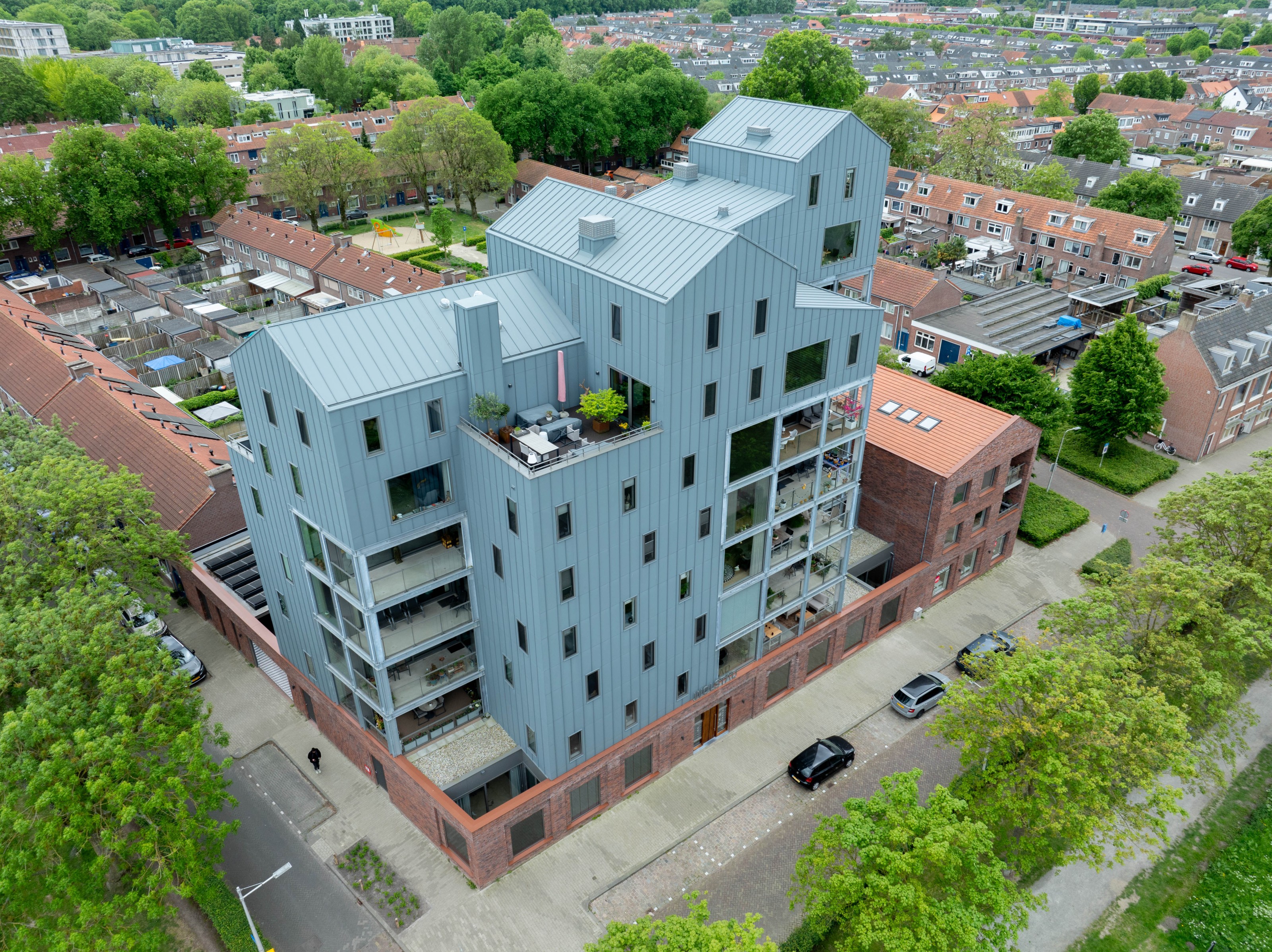 De overgang tussen de plint en bovenbouw is uitgesproken – en technisch complex. “Je werkt met totaal verschillende systemen. Steen versus metaal. Maatverschillen, werking, waterhuishouding: alles moet kloppen. En er zit nauwelijks speling in,” legt Van der Hamsvoord uit. De samenwerking met aannemer Heerkens van Bavel Bouw en gevelbouwer Van Hoesel Aluminium was hierin essentieel. “Zij namen het ontwerp echt serieus,” vertelt Van der Hamsvoord. “Er zijn details waarbij de tolerantie onder de centimeter lag. Normaal heb je op zo’n schaal wat marge, maar hier moest alles precies aansluiten. We staken veel tijd in het uitwerken van de details. Nog belangrijker: we verzamelden mensen om ons heen die het ontwerp snappen. Die de precisie willen leveren die het vraagt. Dat is niet altijd vanzelfsprekend in de bouw.”