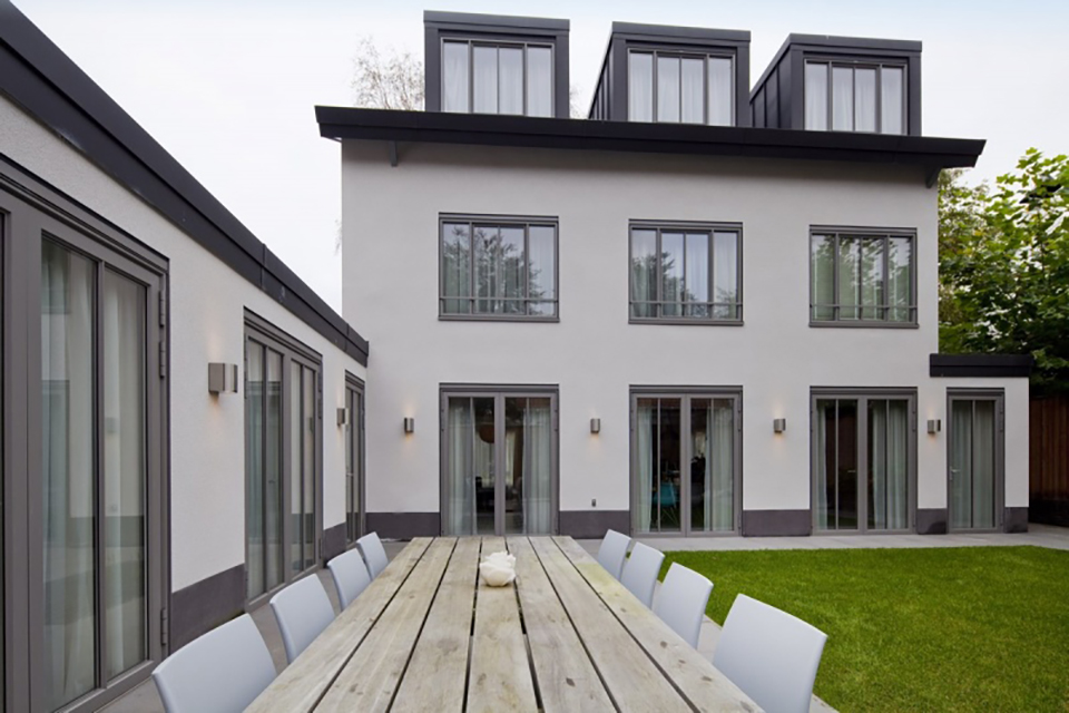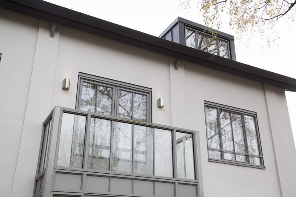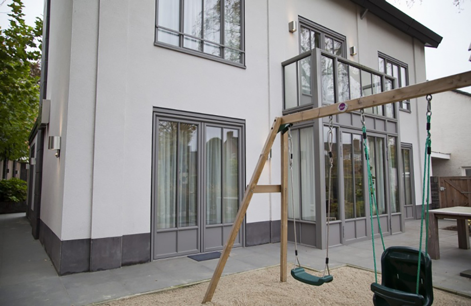 De woning is van buiten wit gestuukt en dat leek aanvankelijk problemen op te leveren met de aansluiting op de kozijnen. Volgens de stukadoor was dit niet mogelijk. Molenaar: “In het buitenland worden huizen veel vaker gestuukt, maar daar worden de ramen van binnenuit geplaatst, dat is makkelijker.” Een extra aluminium profiel van Reynaers om de kozijnen heen bood uitkomst. De aluminium kozijnen werden ook gekozen omdat ze onderhoudsarm zijn. “Daar hebben de bewoners bewust in geïnvesteerd. Alle gebruikte materialen zijn onderhoudsarm, dat geldt bijvoorbeeld ook voor het gepatineerde zink en de polyester betonplaat met daaronder isolatieplaten onderaan het huis”, zegt Molenaar. De kozijnen werden geplaatst door gevelbouwer Gruijters Aluminium v.o.f.