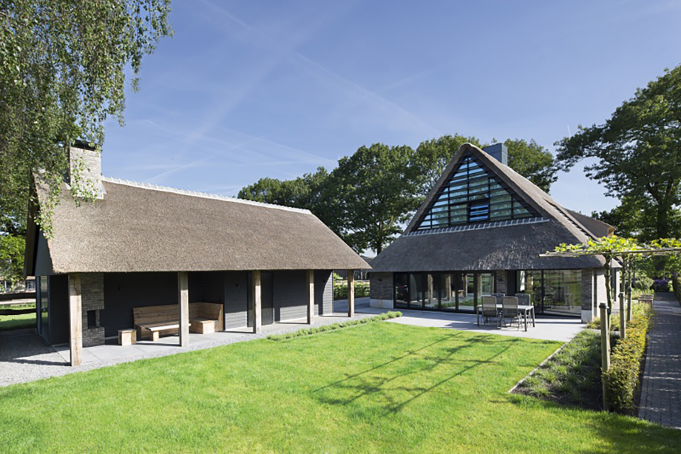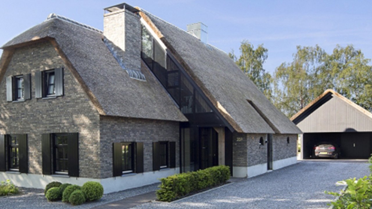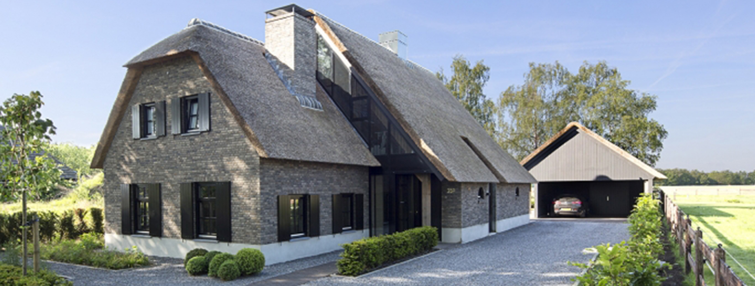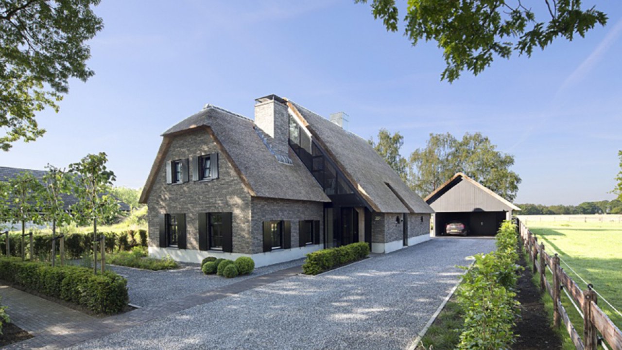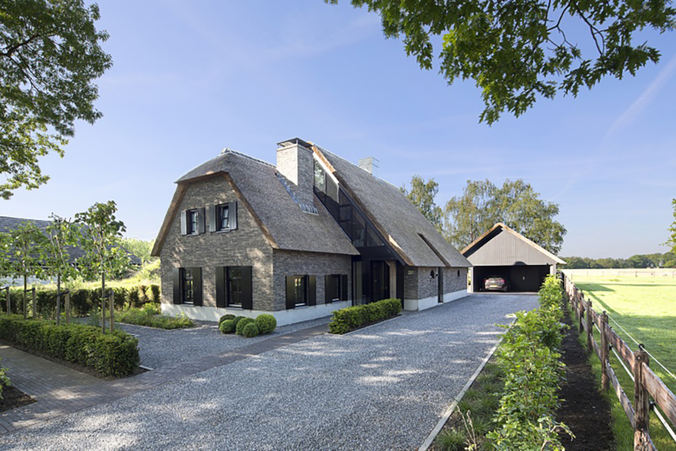 De klassiek ogende vrijstaande boerderijwoning in Riel heeft unieke raampartijen (waaronder in de kopgevel bij de aansluiting van de erker) en daardoor een bijzondere daglichttoetreding in een modern interieur.