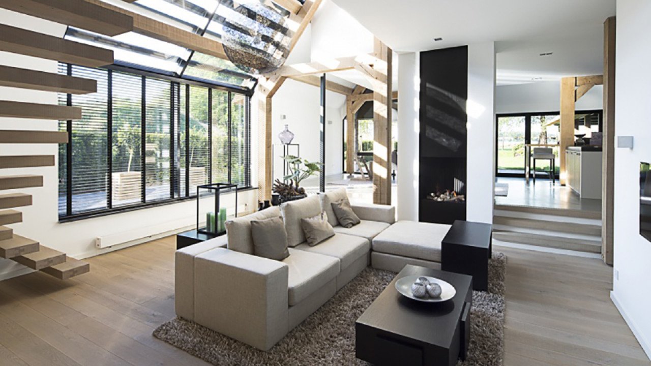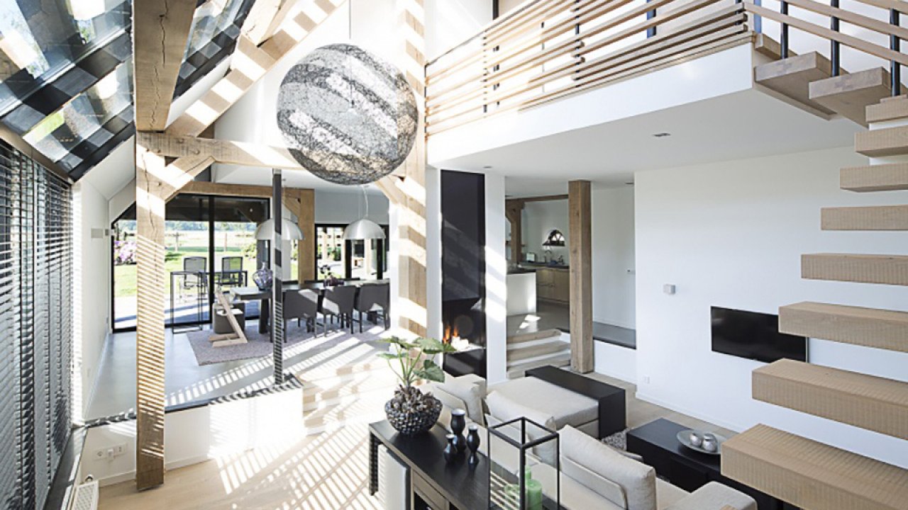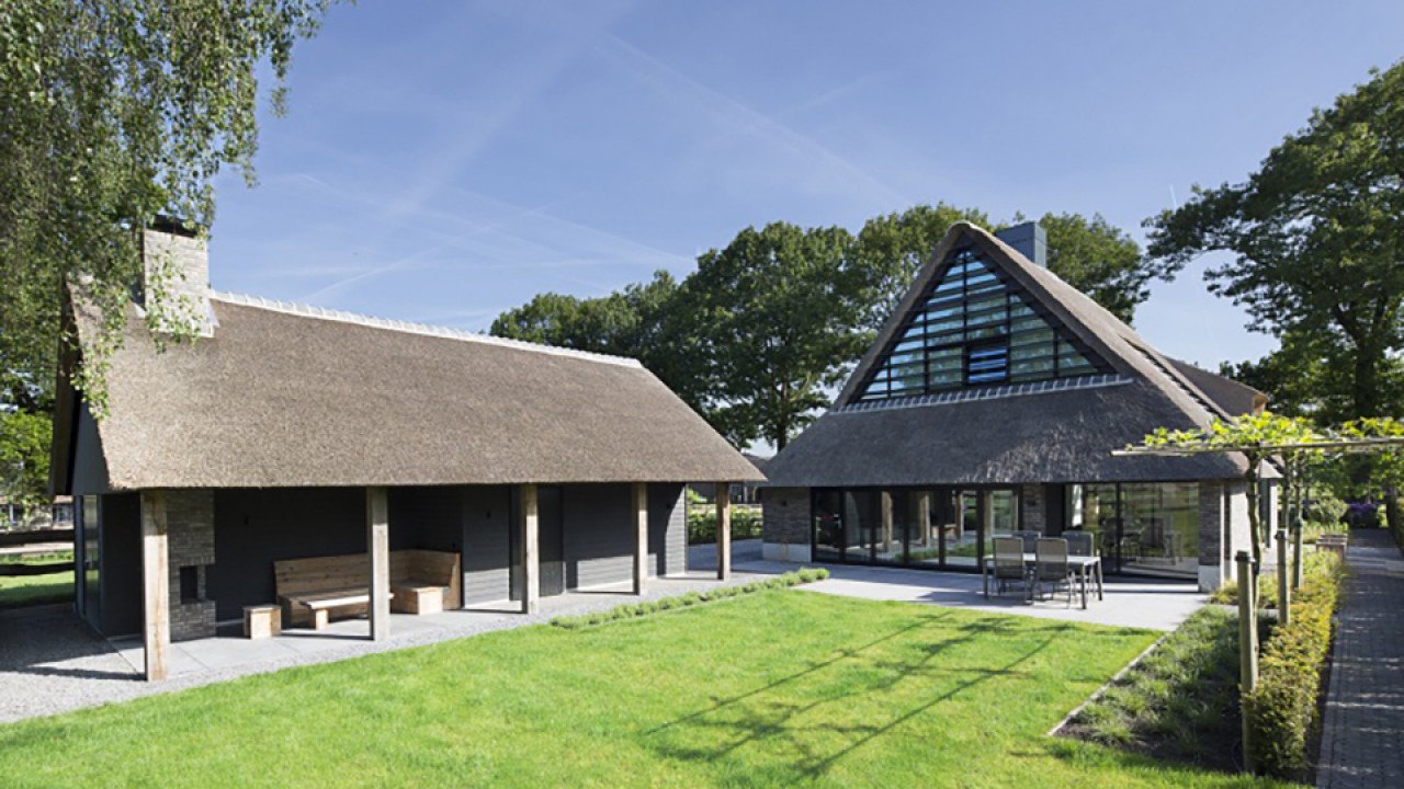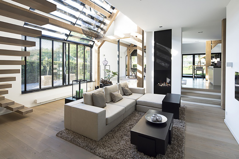 De klassiek ogende vrijstaande boerderijwoning in Riel heeft unieke raampartijen (waaronder in de kopgevel bij de aansluiting van de erker) en daardoor een bijzondere daglichttoetreding in een modern interieur.